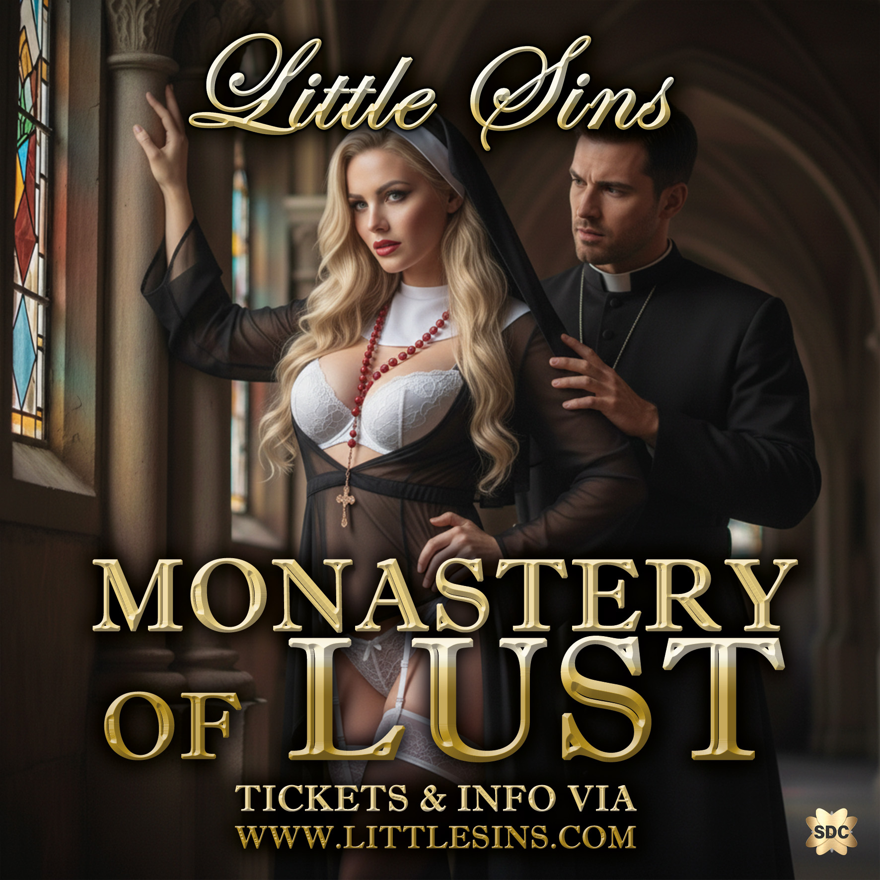 Hier beleef je een zinnenprikkelende reis die begint in de klooster kapel, waar je jouw zonden kunt opbiechten en eindigt in de verleidelijke Dungeons of Lust. Begin jouw nacht met een biecht, laat je dopen in sensualiteit en maak je klaar voor een nacht vol mysterie.